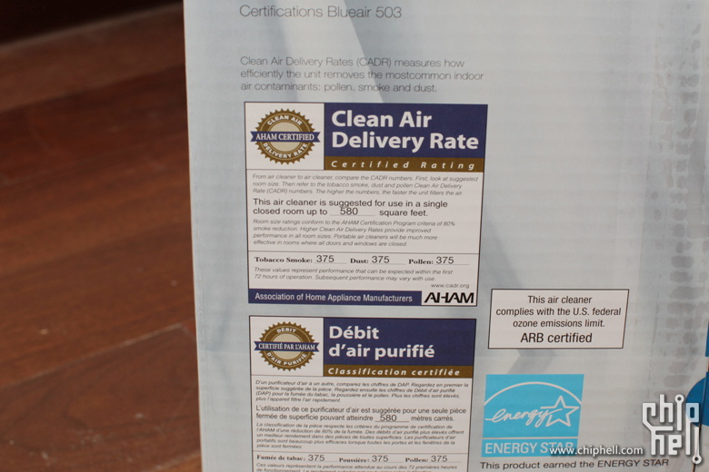 外箱侧面注明了503的AHAM认证信息以及CADR的值
