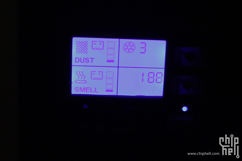 器开启,主机左侧下方液晶面板屏摄一张,可以看到左侧上下分别是微粒污染状态显示以及气体污染状态显示。右侧上下分别是风量大小显示(机器风量分