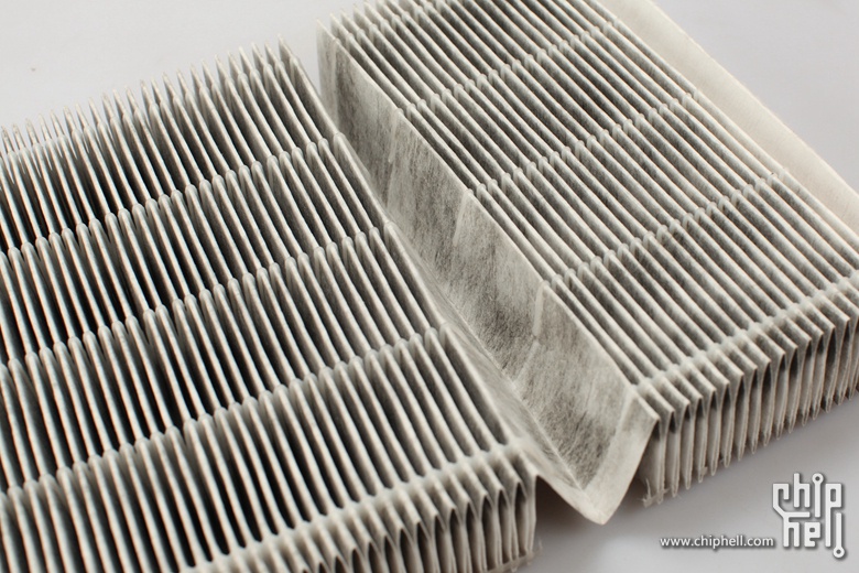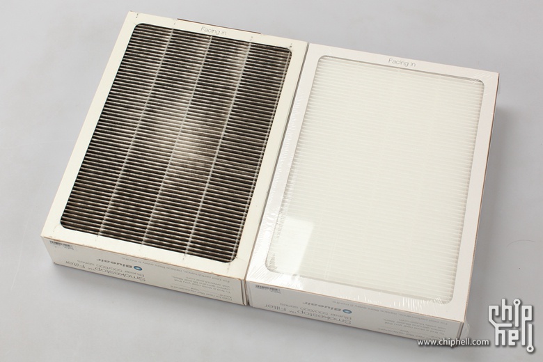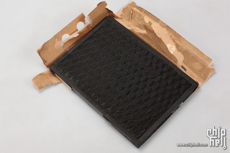 由于外层是硬纸板包裹的,费了很大的力气拆开,可以看到滤网是2层的,上面一层是HEPA滤网,下面是椰壳活性炭滤网