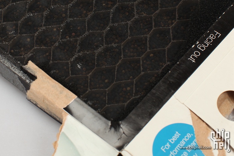 将外面硬纸盒彻底拆掉,取下HEPA滤网,这一面是进风的一面,非常的恐怖。