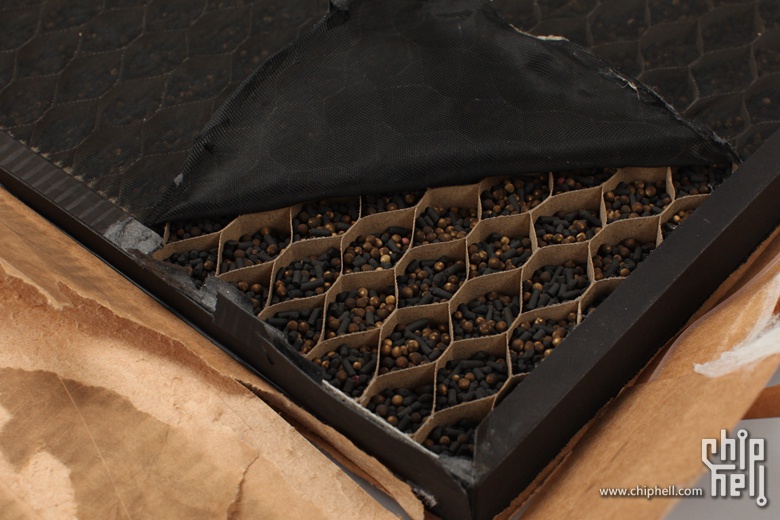 撕开滤网,看看里面,官方说明里面是超强活性炭、活性氧化铝及冷触媒三种配方的气味滤网。