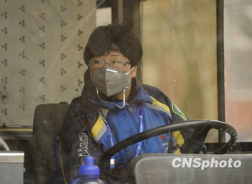 2010年3月20日,一位公交车司机戴上防尘口罩。当日早晨,北京出现明显的浮尘天气,空气中的可吸入颗粒物比较多。19日下午,北京市气象台发布大风蓝色预警。 中新社发 廖攀 摄