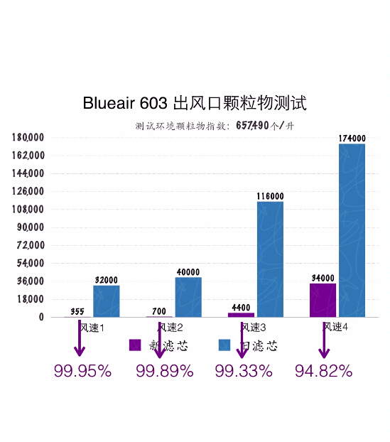 我们能了解到,它在低风速的时候,净化效率确实不错,但是却没有达到它所宣称的对0.1微米的颗粒物净化效果达到99.97以上。