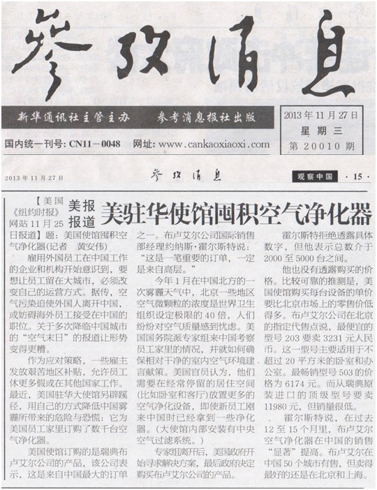 2013年底,一则《美国驻华使馆囤积空气净化器》的消息在雾霾污染严重的中国引起了各界的关注。数十家平面、网络媒体争相报道,微博上也引起 了一番讨论。美使馆采购的正是Blueair的产品。也正是这篇报道,让大家都认识了Blueair这个来自瑞典的空气净化机品牌。之后,爱尔兰驻上海总 领事馆订购了一批Blueair空气净化机,成为Blueair中国的尊贵客户。至今,已经有21个驻华使领馆和外交机构选择了Blueair。而 且,Blueair的产品已经热销于欧洲、北美、东南亚、韩国、日本等50多个国家和地区,成为室内空气净化系统全球领导品牌。Blueair精密的技 术、卓越的产品性能与充满北欧风格的设计感,不仅赢得了大量消费者购买自用,还赢得了不少使领馆、政府机关、医疗机构、高校、顶级酒店和跨国公司的认可与 信赖,成为Blueair的忠实客户。