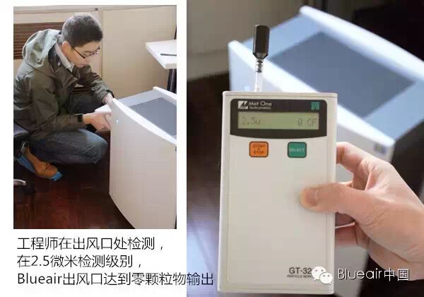 工程师先在Blueair出风口处检测,2.5微米的颗粒数为零,这足以说明Blueair过滤空气的效果。只要轻轻转动Blueair的旋钮,洁净空气就源源不断!