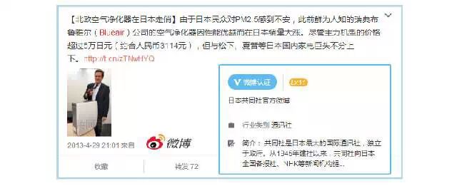 日本共同社2013年4月报道称,由于日本民众对PM2.5感到不安,此前鲜为人知的瑞典布鲁雅尔(Blueair)公司的空气净化器因性能优越而在日本销量大涨。尽管主力机型的价格超过5万日元(约合人民币3114元),但与松下、夏普等日本国内家电巨头不分上下。