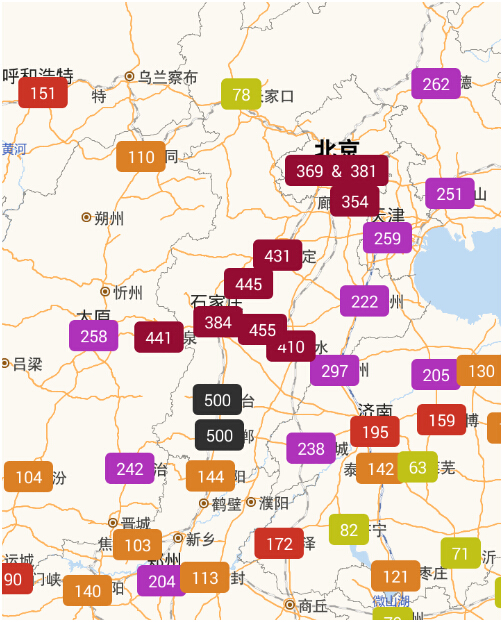 在空气质量地图上可以看到,京津冀区域已经深陷“霾”伏,全国AQI指数 糟糕的河北邢台邯郸一带则出现黑色爆表。