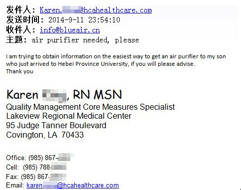 根据邮件地址和签名显示,这位焦急的母亲Karen来自美国著名的500强医院管理公司HCA HEALTHCARE,是一名医疗行业相关工作者。长期的医务工作使Karen意识到洁净空气对于个人身体健康是多么重要,而孩子可能将面对的严重空气污 染,让她心急如焚。
