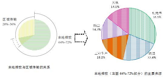 此次研究的主要结论表明,本市空气中PM2.5主要成分为有机物(OM)、硝酸盐(NO3-)、硫酸盐(SO42-)、地壳元素和铵盐 (NH4+)等,分别占PM2.5质量浓度的26%、17%、16%、12%和11%。通过模型解析,全年PM2.5来源中区域传输贡献约占 28-36%,本地污染排放贡献占64-72%,特殊重污染过程中,区域传输贡献可达50%以上。在本地污染贡献中,机动车、燃煤、工业生产、扬尘为主要 来源,分别占31.1%、22.4%、18.1%和14.3%,餐饮、汽车修理、畜禽养殖、建筑涂装等其他排放约占PM2.5的14.1%。