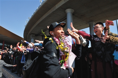 大巴渐渐地驶离特殊通道,此时球员们才看到,在航站楼上方,还有2层球迷围在护栏边上,用手机拍着,嘴里喊着,“北京是冠军!”