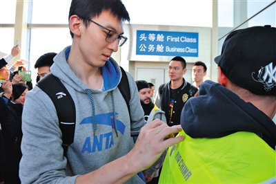 这次胜利凯旋,首都机场为北京男篮安排了贵宾通道。在贵宾室里,球员和教练被鲜花和掌声包围了,机场地勤人员利用近水楼台之便,纷纷与球员合影、签名留念。一名负责地勤交通的工作人员快速冲到李根跟前,让他在自己衣服上的反光条处签名。