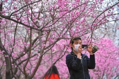 昨天,东城区明城墙遗址公园,一位游客戴着口罩赏花。