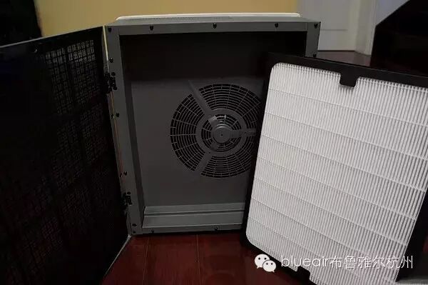 整个背后都是进风口。用力掰蓝色的地方就能打开后盖。打开后可以看到里面的过滤网。滤网对着电风扇的一面是黑色的。