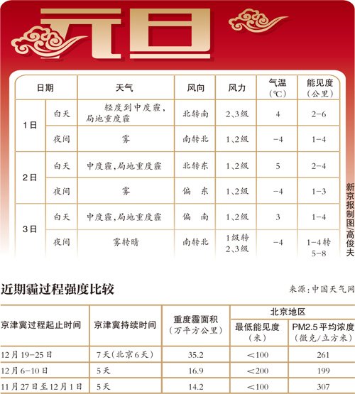 其中,31日夜间至明年1月3日,北京、天津、河北中南部、山东中西部、河南中北部等地有中度霾,局地重度霾,并伴有重度污染,局地严重污染;3日,北京、天津、河北南部霾天气有所缓解。