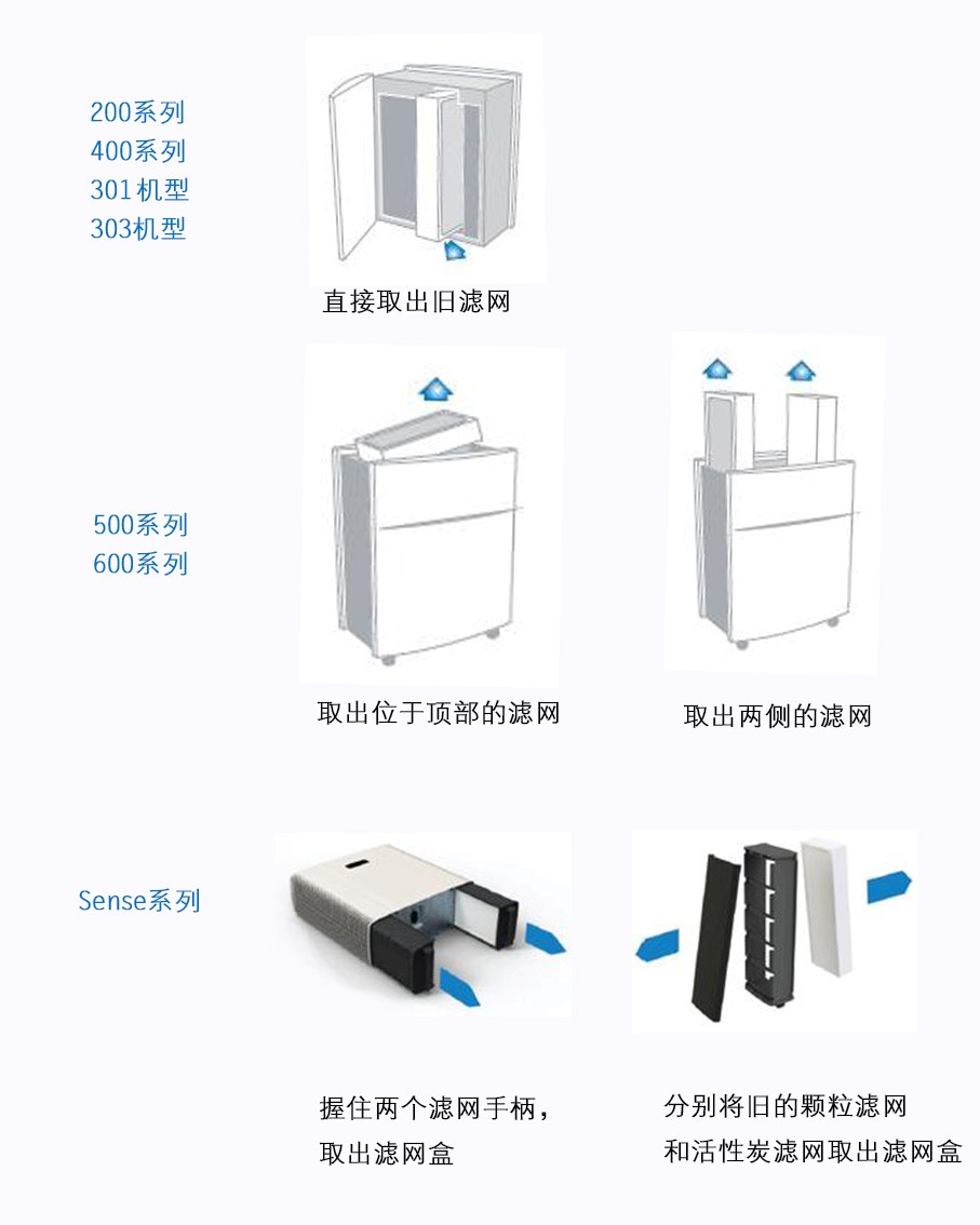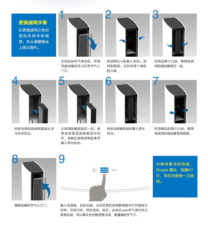 虽然Blueair空气净化机有多个系列和多种型号,但更换滤网的方式大同小异,过程很简单,注意一些细节就好:
