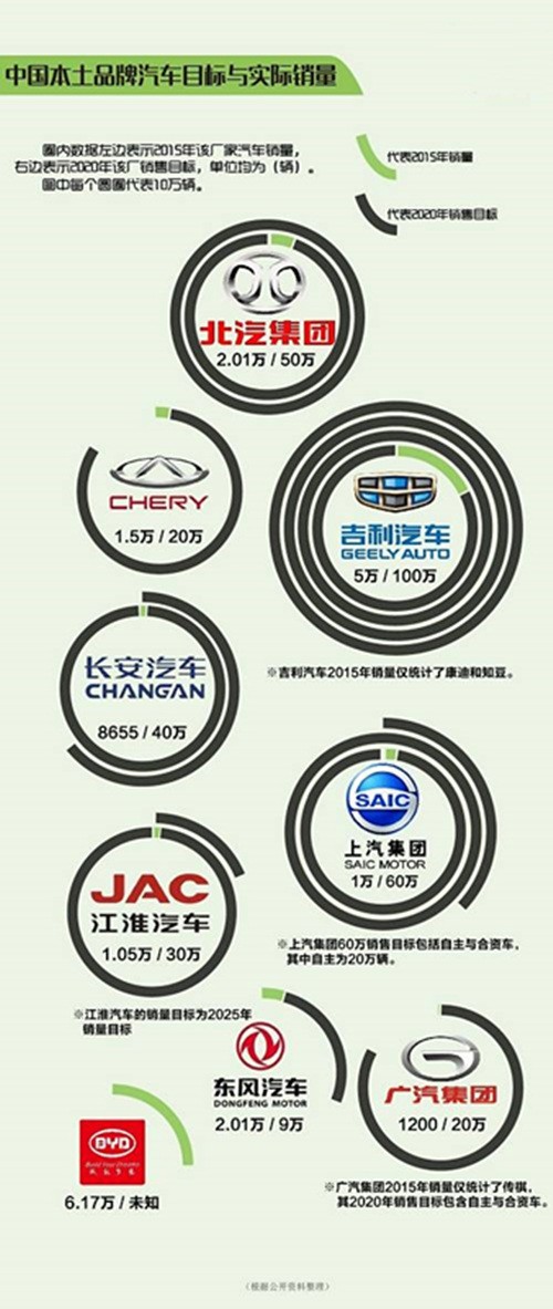 长城汽车董事长魏建军之前曾宣称“短期内不会推出电动车”,但在2015年6月份,长城汽车突然宣布投资170.61亿元用于新能源汽车项目。另一家中国私营汽车制造商吉利汽车,在2015年11月份的广州车展上公布的新能源汽车销量目标更是语惊四座:2020年达到100万辆。