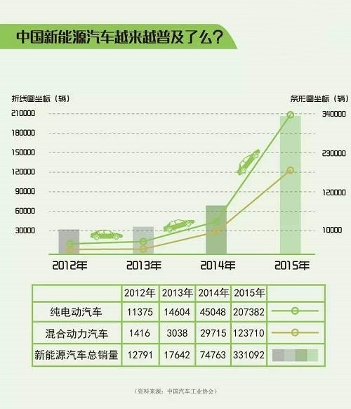 中国的新能源汽车市场在2015年实现了快速增长。当年,市场销量为33.11万辆,相比去年同比增长了340%。