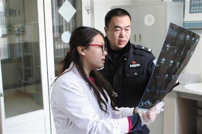 近日,房山区第一看守所民警马振兵在和驻所医生交流一在押人员的病情。 新京报记者 尹亚飞 摄