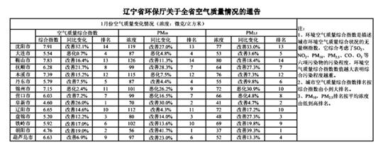 数据显示,2016年1月份全省城市空气质量情况,空气质量综合指数排名前三位的分别为:阜新、朝阳、盘锦,后三位的分别为:本溪、鞍山、沈阳。14个城市空气质量同比改善的有12个,改善比例达到85.7%,沈阳同比改善32.1%,为全省 高。