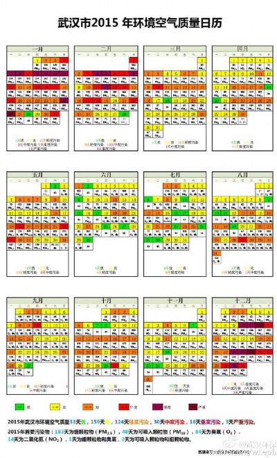 近日,一张武汉市2015年环境空气质量日历刷屏朋友圈,6种颜色标注每天空气质量的污染情况,一眼就能看清当天天气的好坏。