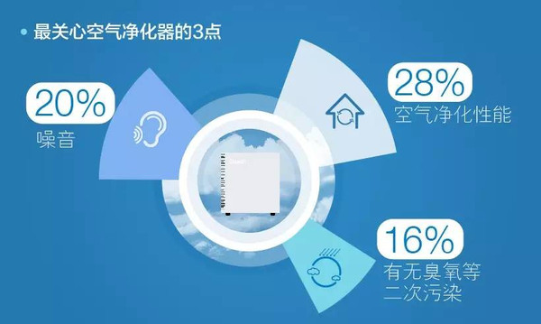 选购空气净化器是一个全面的过程,在购买空气净化器时 关心什么一栏中,空气净化性能是用户选择 关心的问题(28%),而噪音(20%)和有无臭氧等二次污染(16%)为其次。说明真正高效去除室内污染是关键,其次需要考虑噪音是否会影响人们工作和休息、是否会有臭氧等二次污染。