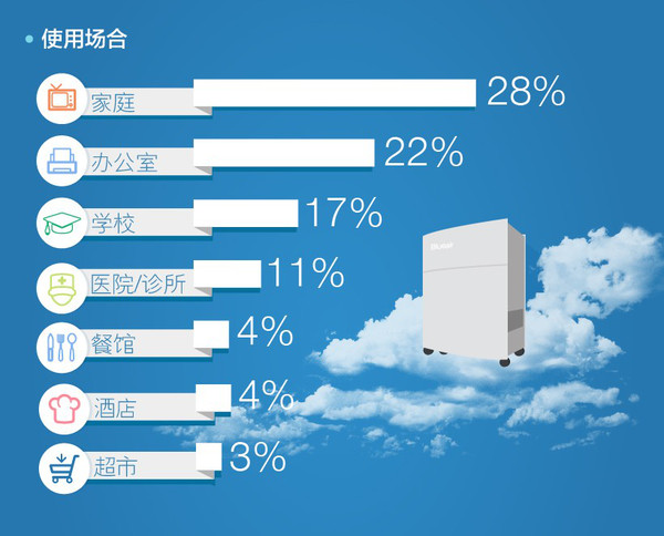 中国的消费者购买空气净化器绝大多数是放置于家中、办公室以及学校。医院诊所也占到相当一定的比例(11%)。诸如餐馆、超市、酒店等消费型场所则占比较少。