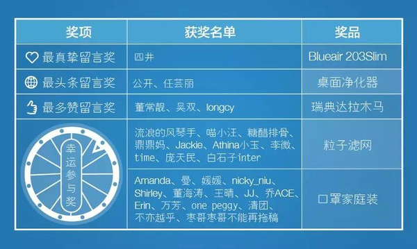 请所有获奖的小伙伴们在3月15日前给Blueair官方微信发送私信,告知你的【姓名、联系电话以及邮寄地址】,以便我们第一时间将礼品寄到你的手里哦。逾期未与我们联系,视为放弃。