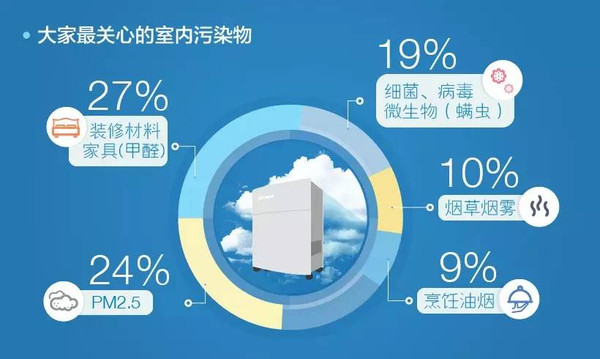 Blueair的调研提供了一个非常有趣的现象,显示了哪些物质或情况会让消费者真正担心他们生活和工作中的空气环境。中国消费者 关心的三大室内污染物为装修材料及家具(甲醛等)、PM2.5以及细菌、病毒、微生物(螨虫)污染,分别占比27%、24%和19%。其次,烟草烟雾污染(10%)以及烹饪油烟(9%)同样占据统计前列。
