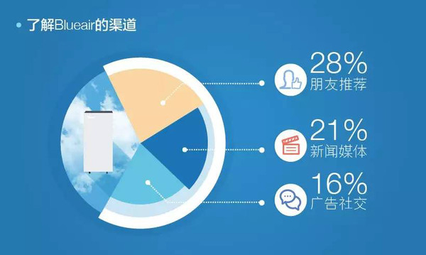 后,我们发现参加调研的28%的消费者通过朋友推荐了解Blueair的。紧接其后的是新闻媒体和广告社交媒体,分别占到21%和16%。这表明,中国消费者在购买产品时的品质信赖来自客户真实的使用体验和对生活的改善。