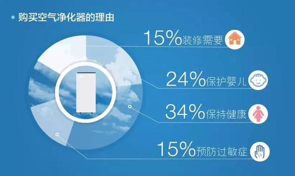 至于为什么会购买空气净化器,较多数人(34%)是为了保持个人身体健康。同时,有24%的消费者是为了保护婴幼儿健康,免受室内空气污染。这表明,健康的生活方式仍然是中国消费者 关心的话题。15%的消费者则为家中装修以及过敏症感到担忧。