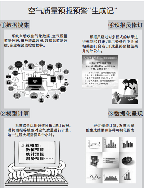 以数值预报为主,大连空气质量预报预警系统还同时采用统计预报和潜势预报等模型。包艳英告诉记者,这两种模型主要发挥辅助作用,对数值预报结果进行参考和纠偏。