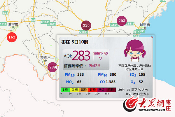 枣庄空气质量指数283,首要污染物为PM2.5