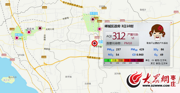 3月3日讯 3月3日上午10时,记者从山东省城市环境空气质量信息发布平台上了解到,今天上午10时,枣庄遭遇“重度污染”,空气质量指数为284,全省第二。仅次于临沂(330),首要污染物为PM2.5。全市8个空气质量监测点被污染全部“攻陷”,市中区政府、高新区、峄城区政府、台儿庄环保局等4个监测点“严重污染”,污水处理厂、市环保局、薛城区环保局、山亭区环保局等监测点“重度污染啊”。