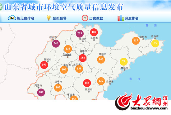 根据山东环保厅官实时监测数据显示,截至9时,全省十七地市中威海、青岛、空气质量为良,济南、泰安、济宁、枣庄、莱芜、烟台、日照、潍坊空气质量为轻度污染,淄博、聊城、临沂、东营空气质量为中度污染,菏泽、滨州、德州、空气质量为重度污染,滨州AQI平均值为223,仅次于德州市,位列全省倒数第二。