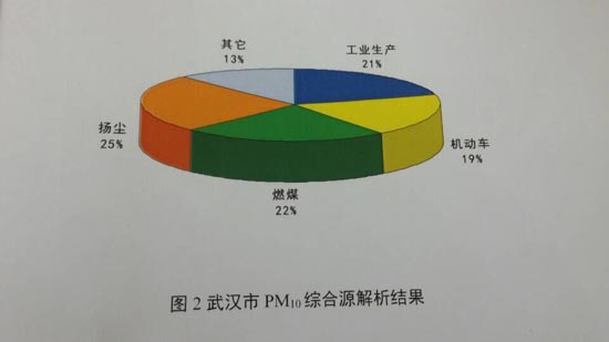 研究结果分析显示:武汉PM2.5主要来源为:工业生产占32%、机动车占27%、燃煤占20%、扬尘占9%,其他占12%;PM10主要来源为扬尘占25%、燃煤占22%、工业生产占21%、机动车占19%,其他占13%。