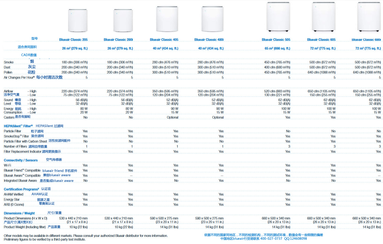 blueair新品205/280i/405/480i/505/605/680i型号参数对比图示