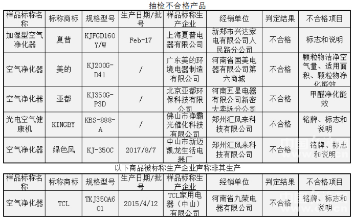 在不合格的产品中,夏普的KJFGD160Y/W加湿型空气净化器不合格项目为“标志和说明”;KINGBY的KBS-888-A光电空气健康机和绿色风的KJ-350C空气净化器不合格项目为“铭牌、标志和说明”;而标称商标为TCL的TKJ350A601空气净化器被标称生产企业声称非其生产。
