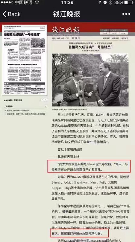 “我太太给家里买的是Blueair空气净化器。”昨天,马云难得在公开场合透露自己的私事儿。