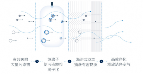 但是为何能达到如此立竿见影的效果呢?因为它的HEPASilent核心过滤技术非常强大, 如下图所示,首先通过风机引导大量污染物到滤网上,先使大颗粒物带负电,再经过渐进式滤网过滤病毒及甲醛、异味等气态污染物, 后排出洁净的空气,因为是渐进式的,每一层的过滤任务不同,不会让所有污染物堆积在同一层,而是对大颗粒和小颗粒物进行分步处理,所以噪声小,能耗小,而且对细菌和病毒等污染物过滤彻底。